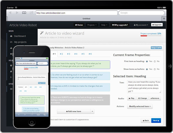 If you like to do everything on your phone or iPad, now you can also create article marketing videos on it too! Article Video Robot is fully HTML5 designed and runs on all mobile phones and devices. No messy download or app installations required.